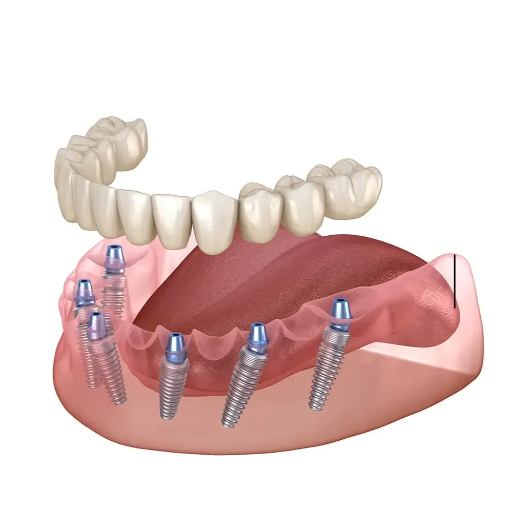 All-On-X Implants are a special way to replace missing teeth. Instead of getting one implant for each missing tooth, a few implants (usually 4 or more) are placed in your jaw to support a full set of new teeth. It's like building a strong bridge with solid support beams, making sure your new teeth are stable and won't move around.